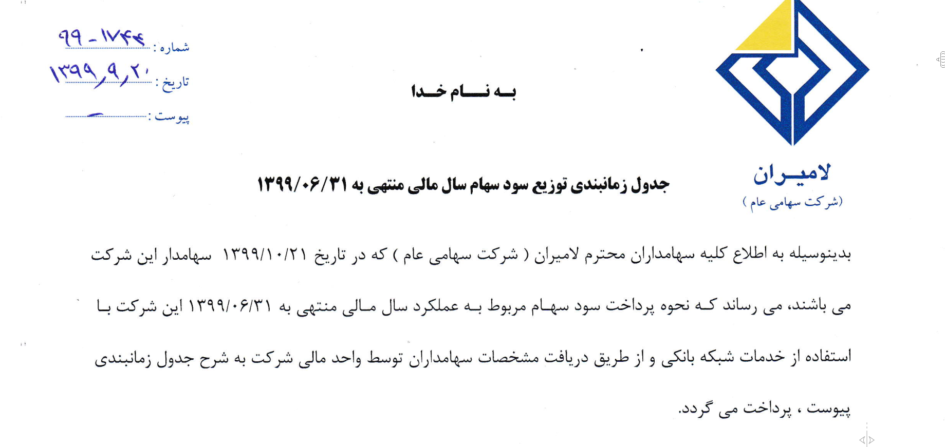 بدینوسیله به اطلاع کلیه سهامداران محترم لامیران ( شرکت سهامی عام ) که در تاریخ 1399/10/21 سهامدار این شرکت می باشند، می رساند کـه نحوه پرداخت سود سهـام مربوط بـه عملکرد سال مـالی منتهی به 1399/06/31 این شرکت بـا استفاده از خدمات شبکه بانکی و از طریق دریافت مشخصات سهامداران توسط واحد مالی شرکت به شرح جدول زمانبندی پیوست ، پرداخت می گردد.