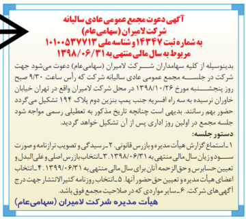 آگهی دعوت مجمع عمومی عادی سالیانه شرکت لامیران (سهامی عام) تاریخ مجمع 1398/10/26 ساعت 9:30 صبحAdministrator1399-10-14آگهی دعوت مجمع عمومی عادی سالیانه شرکت لامیران (سهامی عام) برای سال مالی منتهی به 1398/06/31 به شماره ثبت14347و شناسه ... ادامه مطلب